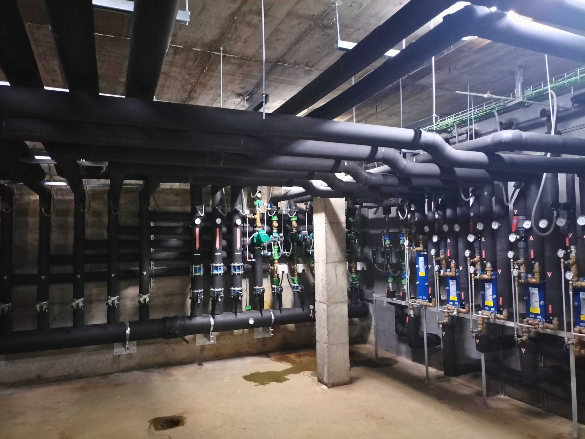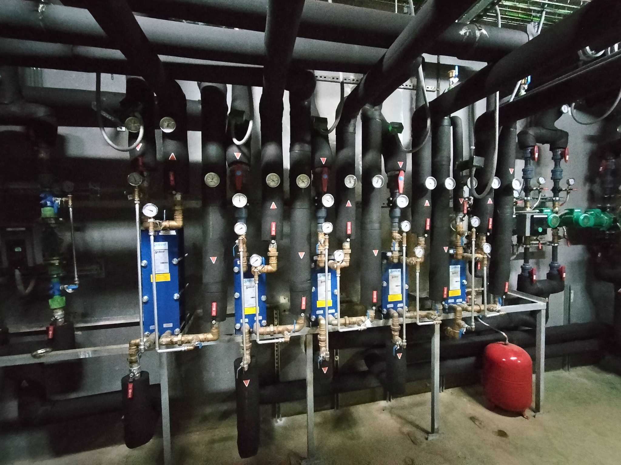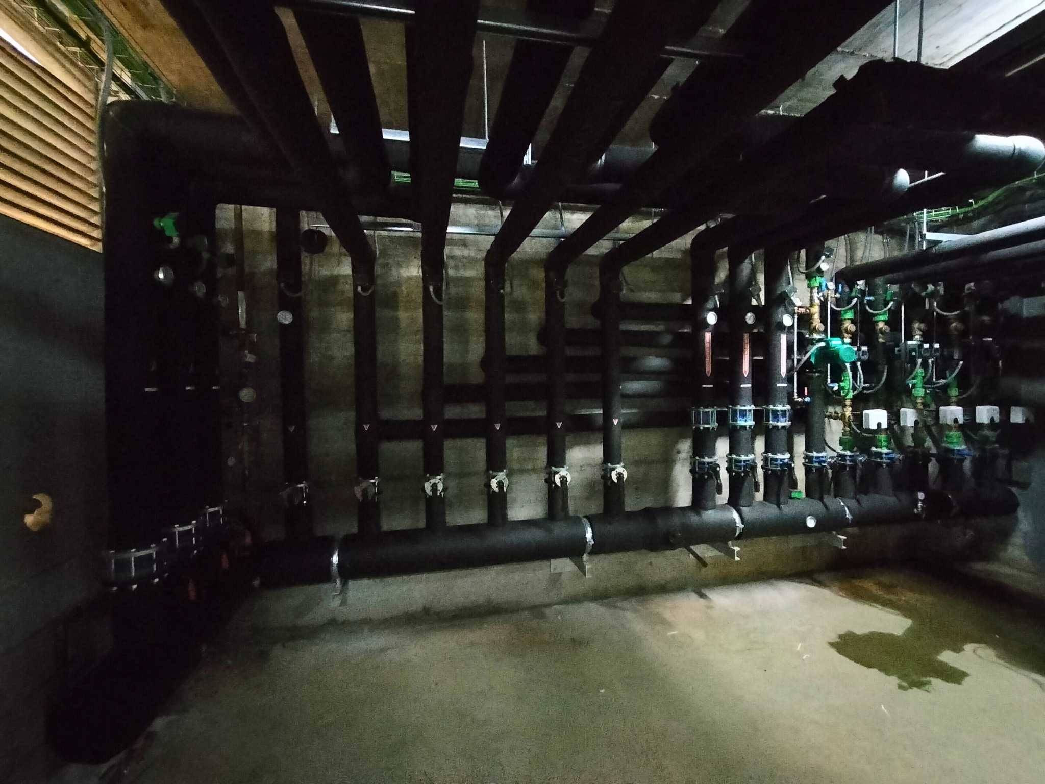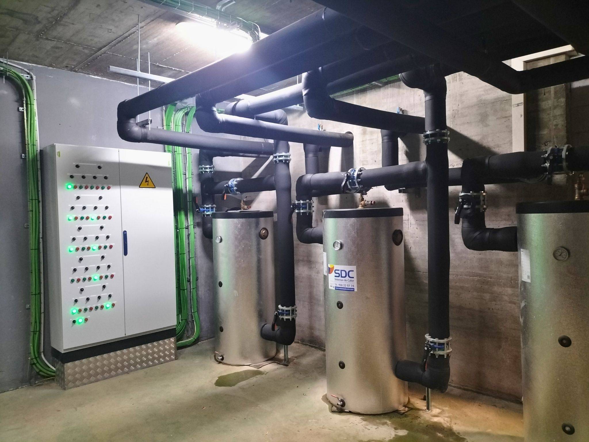 El alcance de los trabajos ejecutados por Sistemas de Calor ha incluido la instalación de toda la sala de bombeo y producción térmica, así como la ejecución de la obra civil del cerramiento, las puertas correderas para las máquinas exteriores y la fabricación e instalación del cuadro de control y fuerza.